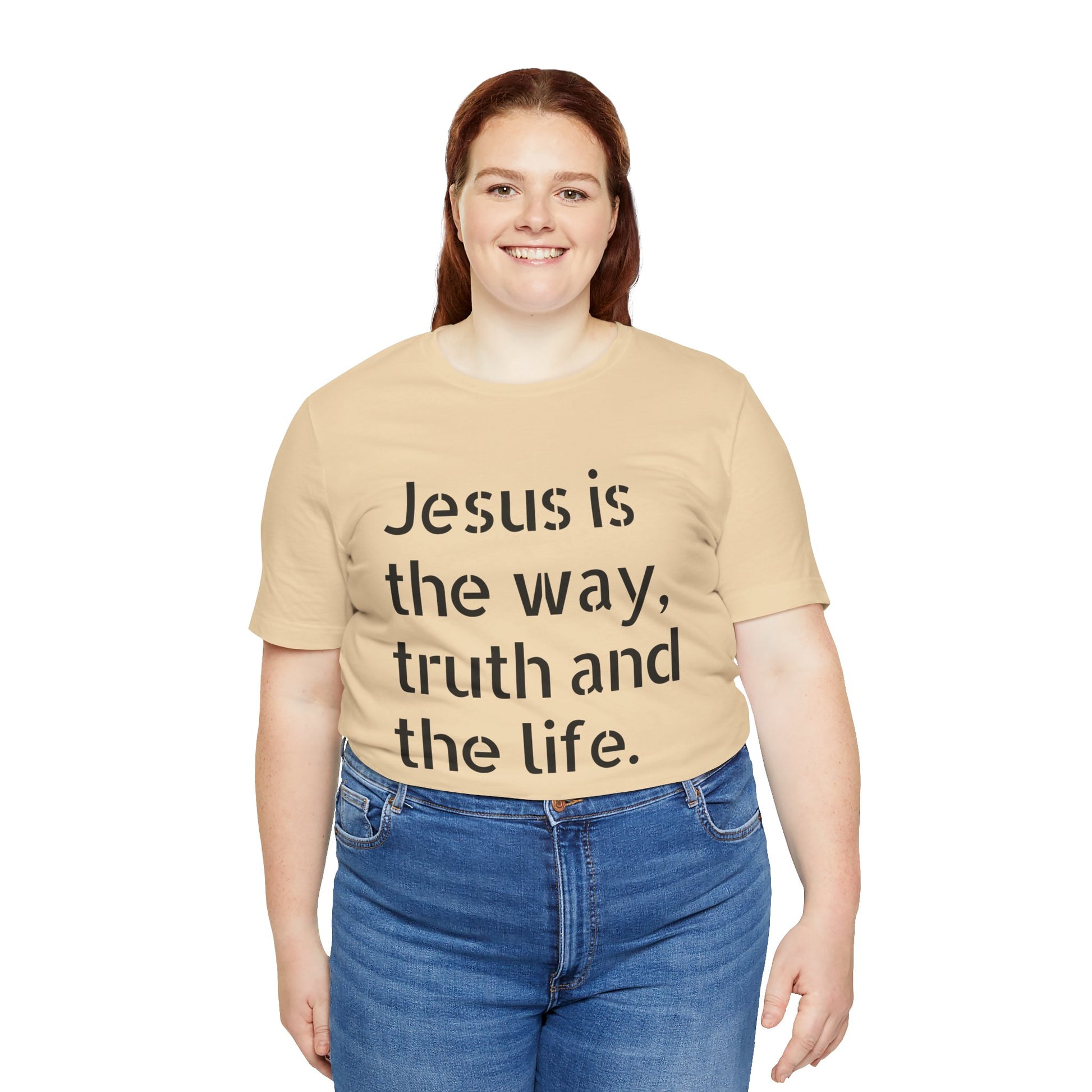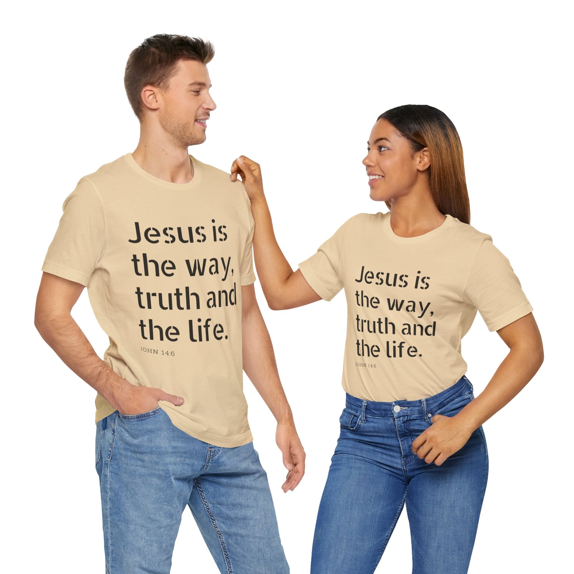 Introducing the first piece in our Wear Your Faith on Your Sleeve Collection—a design that’s close to my heart and my absolute favorite. This classic unisex jersey t-shirt boldly proclaims, “Jesus is the Way, Truth, and Life,” a powerful statement that embodies the essence of faith.